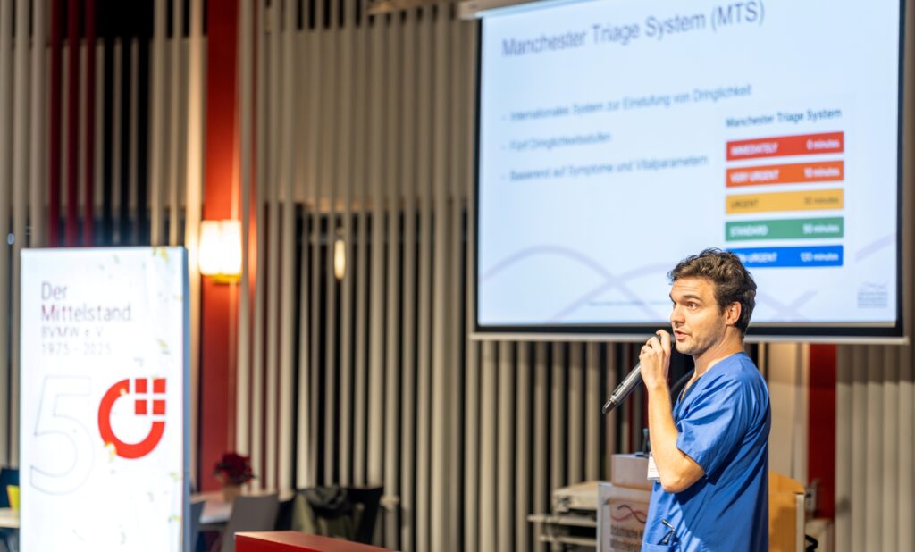 Das zweite große Thema des Abends: ein KI-gestütztes System zur Ersteinschätzung von Notfällen. Es strukturiert Protokolldaten, priorisiert Fälle und hilft, in kurzer Zeit die relevanten Informationen herauszufiltern. Wichtige Kernaussagen aus dem Projektteam: