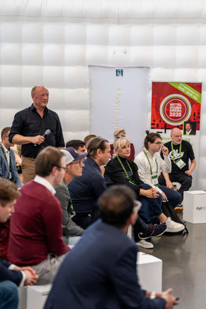 Ein Teilnehmer formulierte zum besonderen Setting der Mittelstandsarena: „Stefan ließ uns ungeordnet auf Pappkartons sitzen. Kurios und gleichzeitig inspirierend.“ – Alle Teilnehmer sitzen auf Papphockern auf einer Ebene. Die Talkgäste in der Mitte und die Teilnehmer darum wie in einer Arena arrangiert.